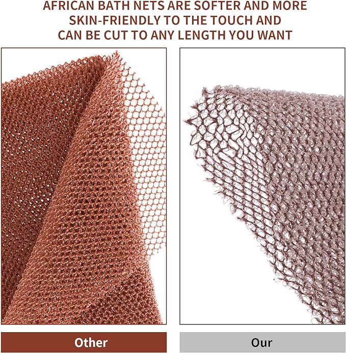 - HIGH-QUALITY MATERIAL: This African exfoliating long bath net sponge is made of reliable nylon material, strong and comfortable, not easy to break. The whole body adopts fine weaving technology, which is stretchable and reusable. African body sponge is a very practical mesh body exfoliator tool, suitable for treating impurities and unclogging pores.